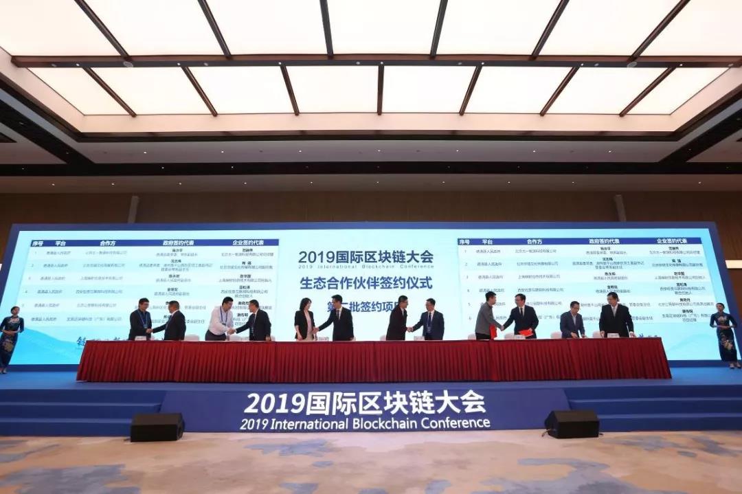 2019国际区块链大会生态合作伙伴签约仪式上,德清县委常委、常务副县长陈亦平,德清县委常委、湖州莫干山高新区党工委副书记、管委会常务副主任沈志伟,德清县人民政府副县长陈永明,德清县人民政府副县长金明龙,湖州莫干山高新区党工委委员、管委会副主任曹根荣,湖州莫干山高新区党工委委员、管委会副主任熊卓越等政府签约代表,与同济区块链研究院院长马小峰,北京太一云技术股份有限公司董事长邓迪,北京好扑信息科技有限公司商务市场总监邓梦,文旅智营董事长孙超,阳山智谷(苏州)商业管理有限公司董事长孙玉龙,杭州复杂美科技有限公司首席执行官吴思进,北京太一智源科技有限公司总经理范丽燕,北京京链文化传媒有限公司副总裁宛强,上海映射信息技术有限公司创始人赵华国,西安纸贵互联网科技有限公司联合创始人宣松涛,北京公易联科技有限公司首席战略官黄晓月,玄易区块链科技(广东)有限公司项目经理谢传明等企业签约代表签署了2019国际区块链大会生态合作伙伴协议。